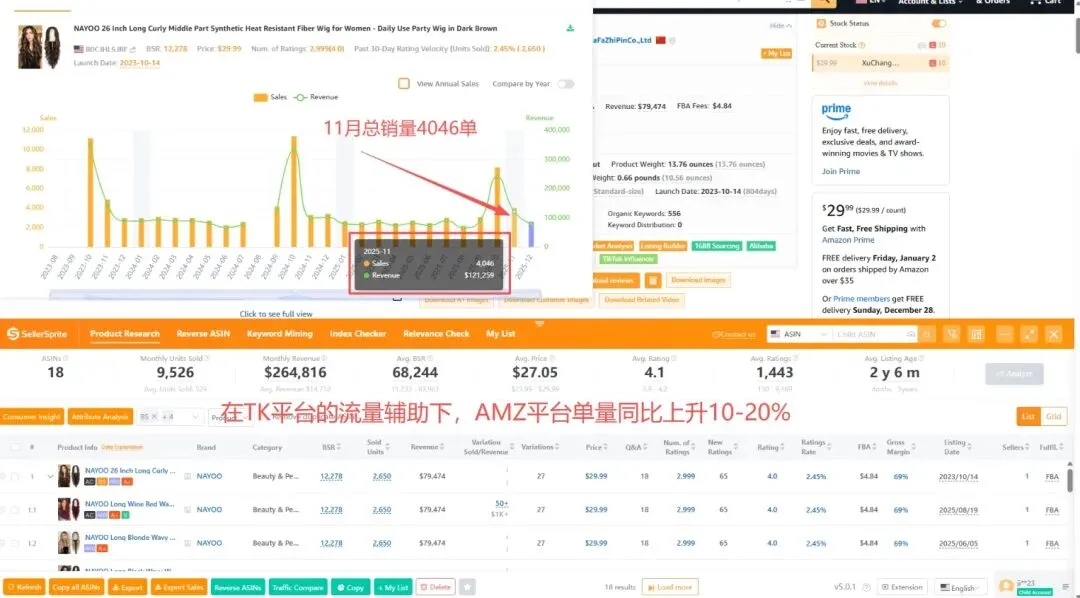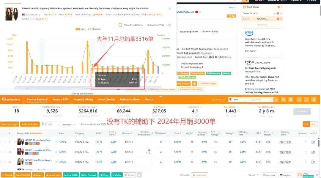 这是一个做假发的卖家,做Tik Tok前后的一个销量对比 去年没有布局TK 11月总量3300单