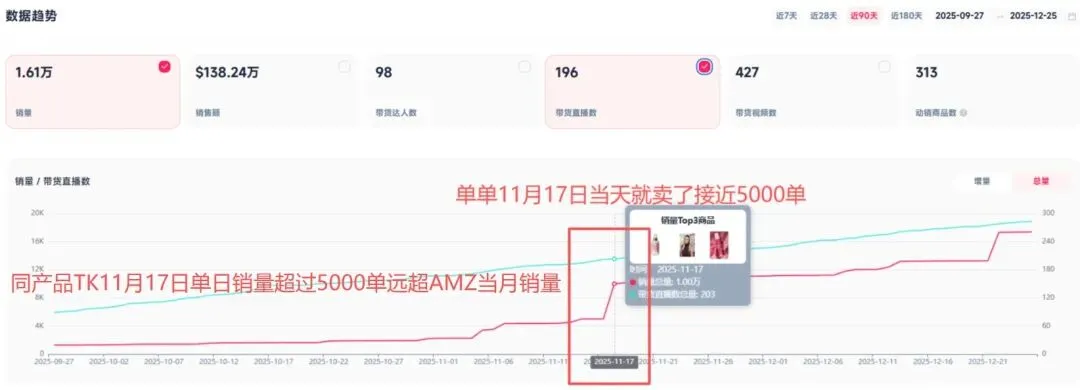 去年没有布局TK 11月总量3300单,今年8月分开始布局TK AMZ11月4000单 TK平台仅11月17日当天就出了接近5000单