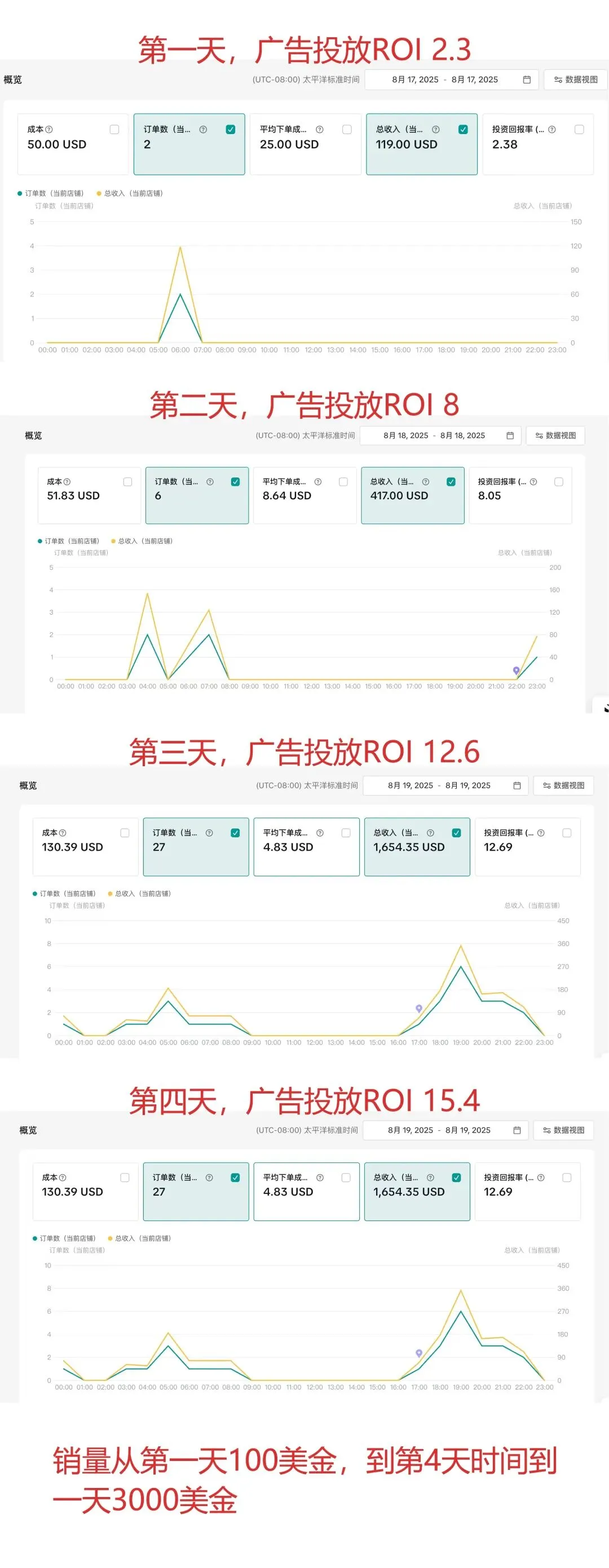 这是另外一个前段时间报名陪跑的学员,4天的时间销量从一天100美金,到一天3000美金,广告投放ROI 从2.3到15.4