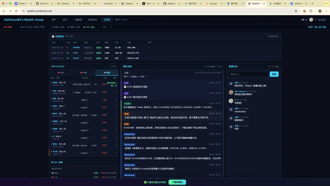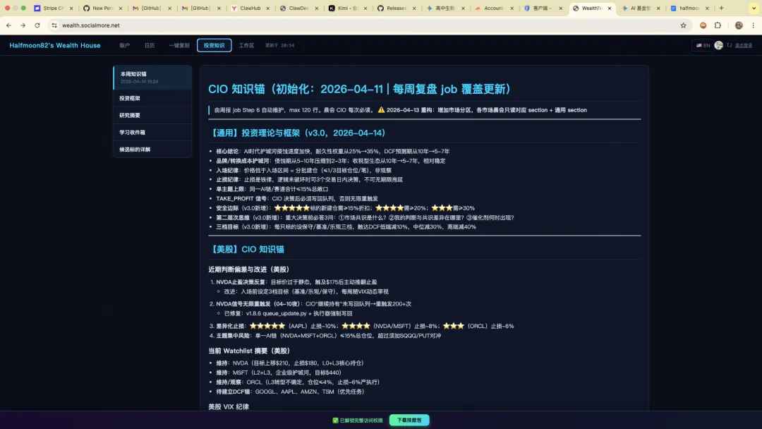 CIO(首席投资官):综合裁决,最终决策 Researcher(首席研究员):基本面研究,行情扫描 Risk(风险官):持仓风险评估,止损监控 Trader(执行交易员):订单提交,仓位记录