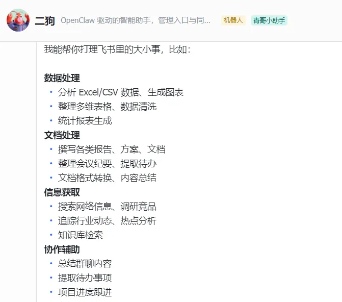 飞书的“办公全家桶”——聊天、文档、会议、任务管理……一个不落,全成了OpenClaw的后援团。