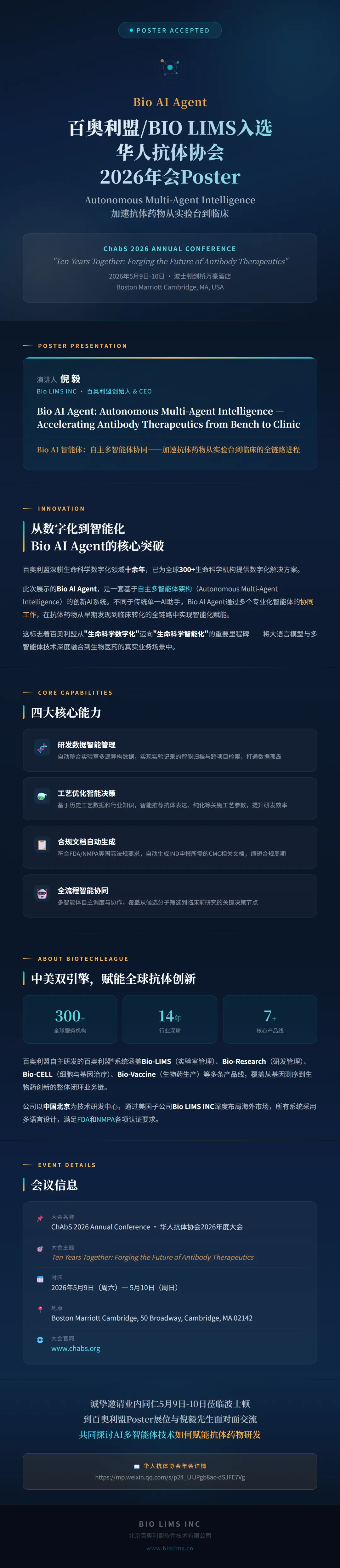 百奥利盟Bio AI Agent入选华人抗体协会(ChAbS)波士顿2026年会Poster展示