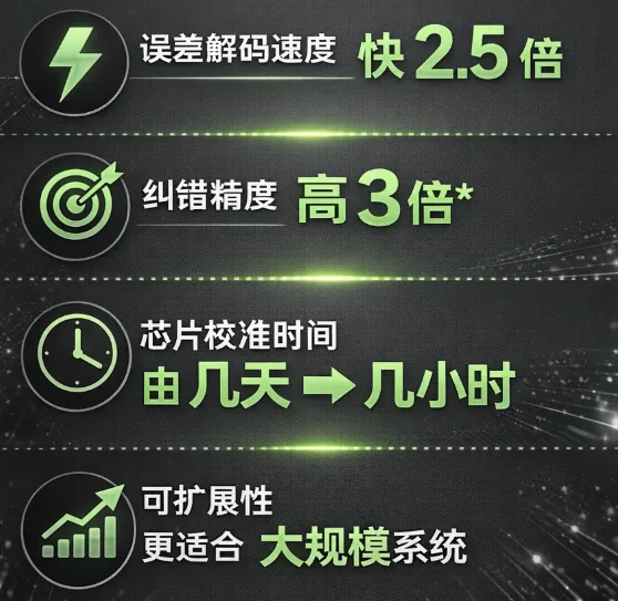 校准从几天到几小时,是可以验证的实际效果,不是概念。纠错解码 2.5x 速度提升 + 3x 准确度提升,有具体测试数据支撑。