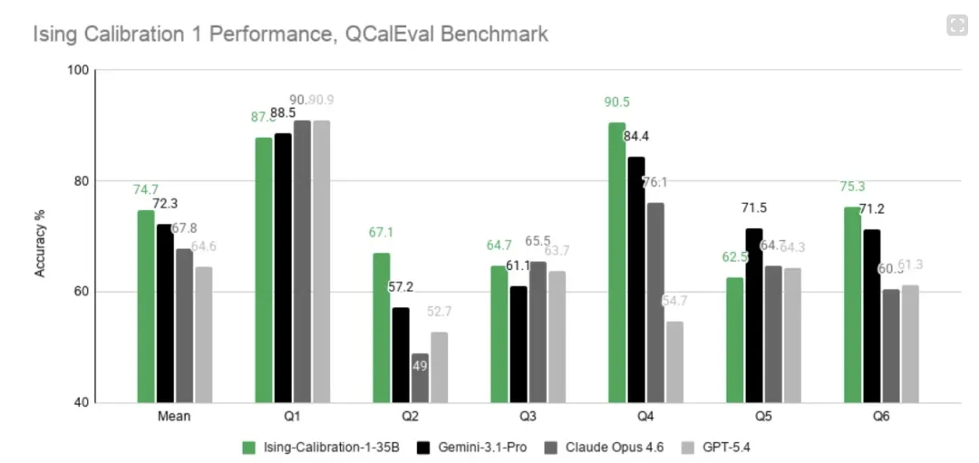 基准测试(QCalEval)里,Ising Calibration 的表现超过了 Gemini 3.1 Pro(+3.27%)、Claude Opus(+9.68%)、GPT(+14.5%)。