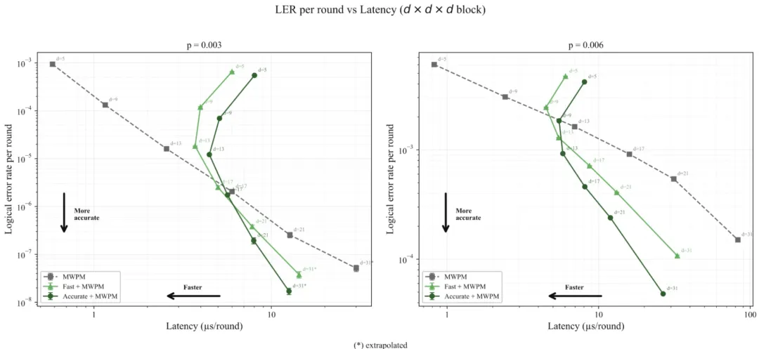 在 d=13、p=0.003 的条件下(专业参数,量子码距和错误率),延迟约 2.33 微秒/轮,最快可到 0.11 微秒/轮。