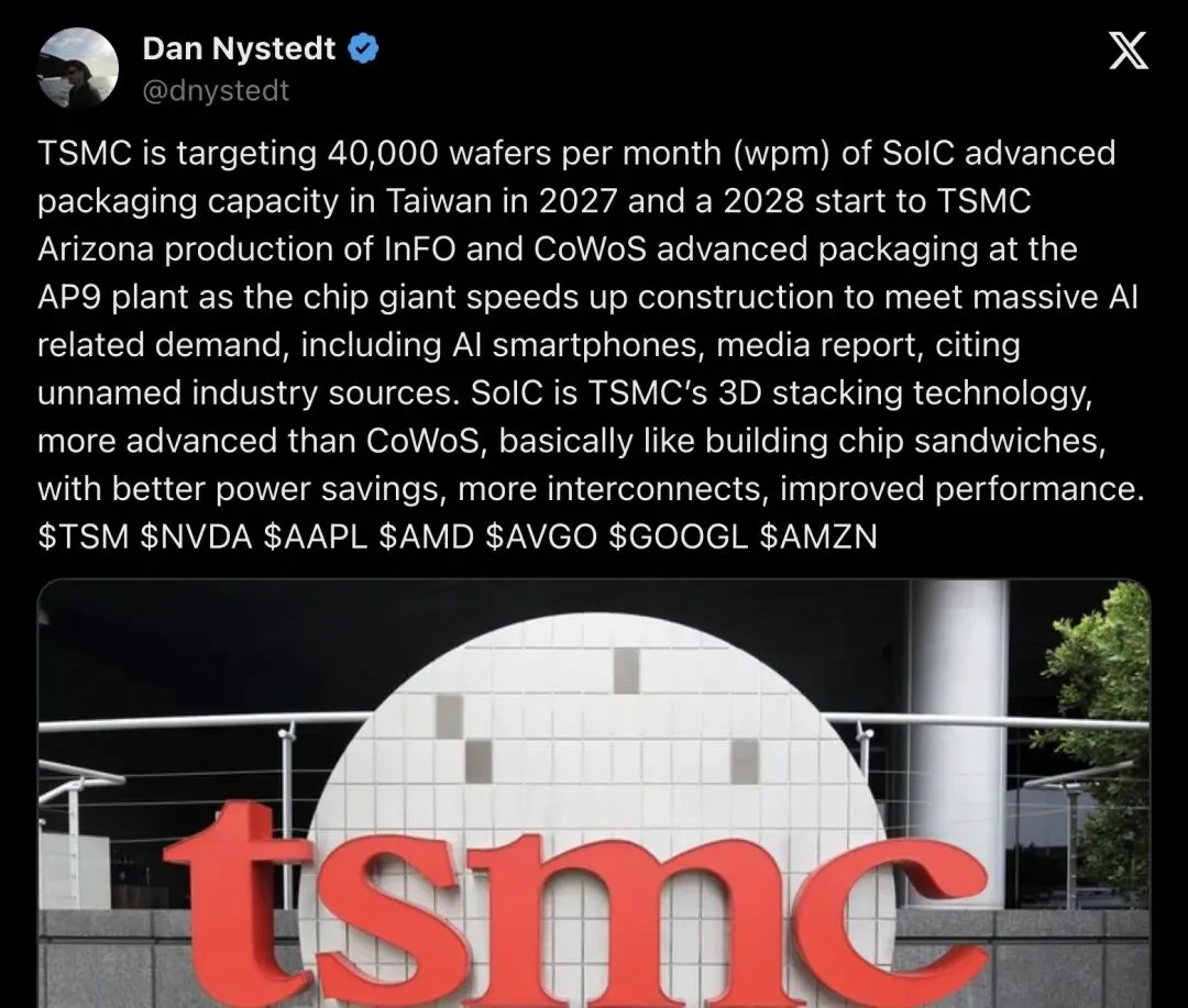 "TSMC is targeting 40,000 wafers per month of SoIC advanced packaging capacity in Taiwan in 2027 and a 2028 start to TSMC Arizona production of InFO and CoWoS advanced packaging at the AP9 plant as the chip giant speeds up construction to meet massive AI related demand, including AI smartphones."