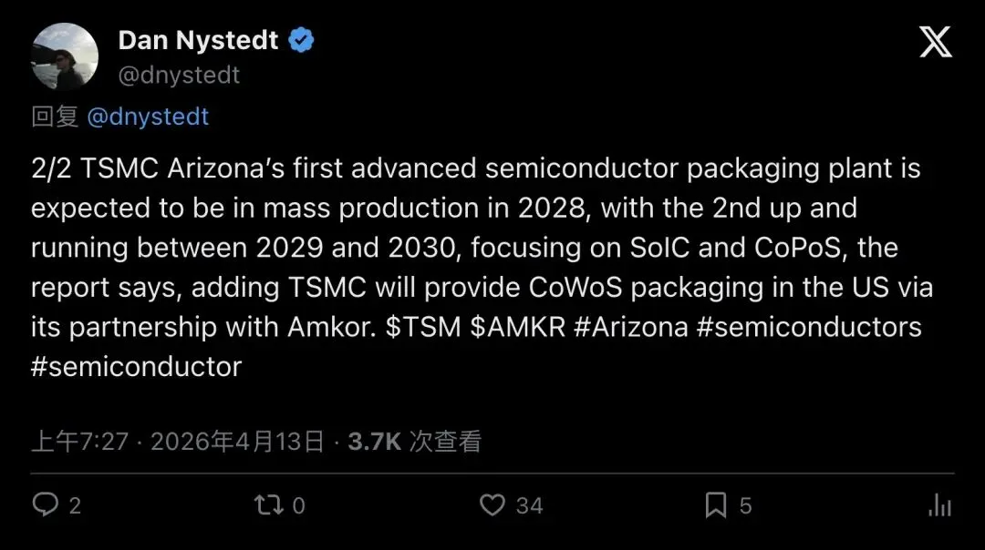 「台积电亚利桑那第一座先进封装厂预计2028年量产,第二座2029到2030年之间投产,重点放在SoIC和CoPoS。台积电将通过与Amkor的合作,在美国提供CoWoS封装服务。」