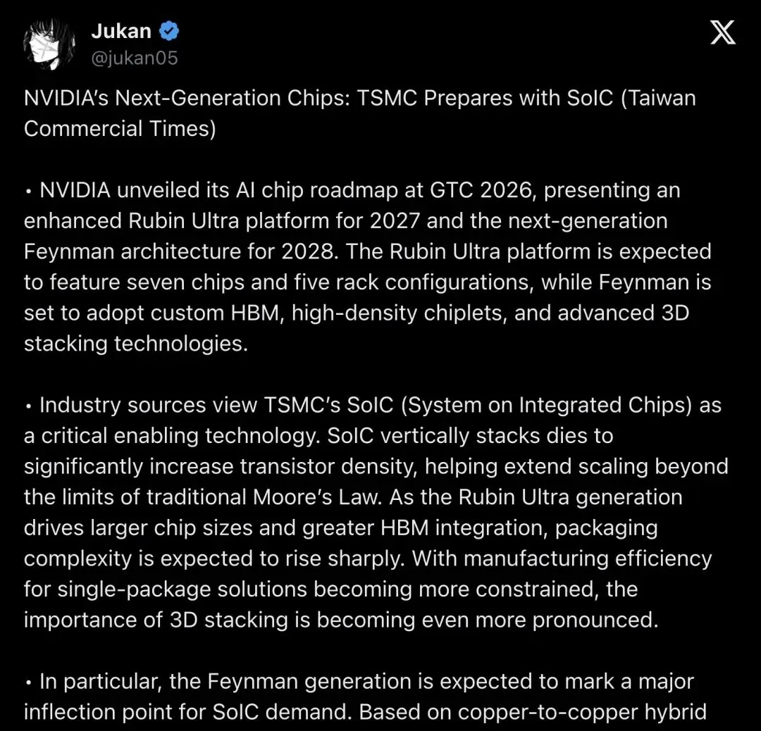 ▲ Jukan (@jukan05) 推文,2.6万次浏览,122点赞,梳理SoIC与下一代NVIDIA芯片的关系