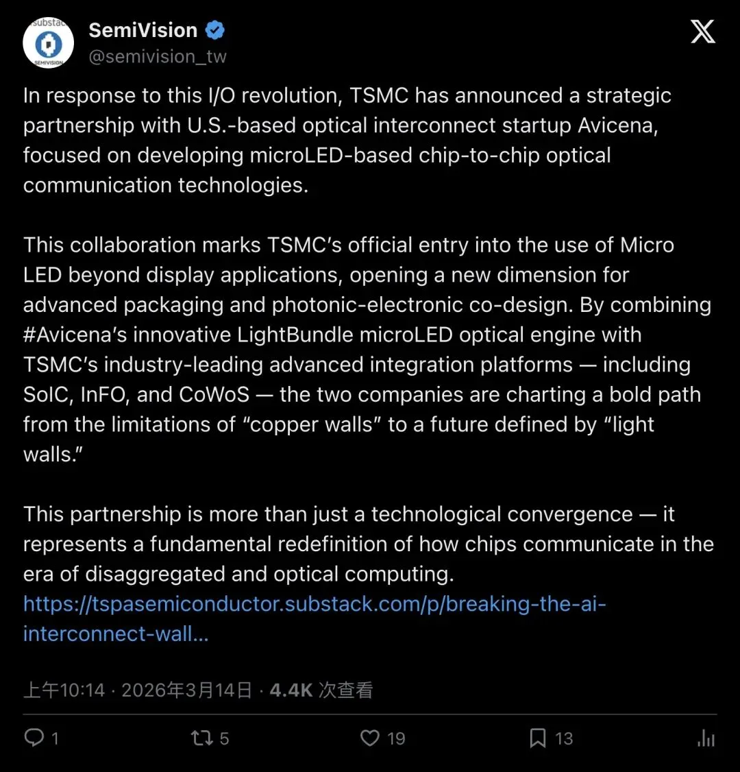 「通过将Avicena的microLED光引擎与台积电的SoIC、InFO、CoWoS平台结合,两家公司正在从'铜墙'的限制,走向由'光墙'定义的未来。」