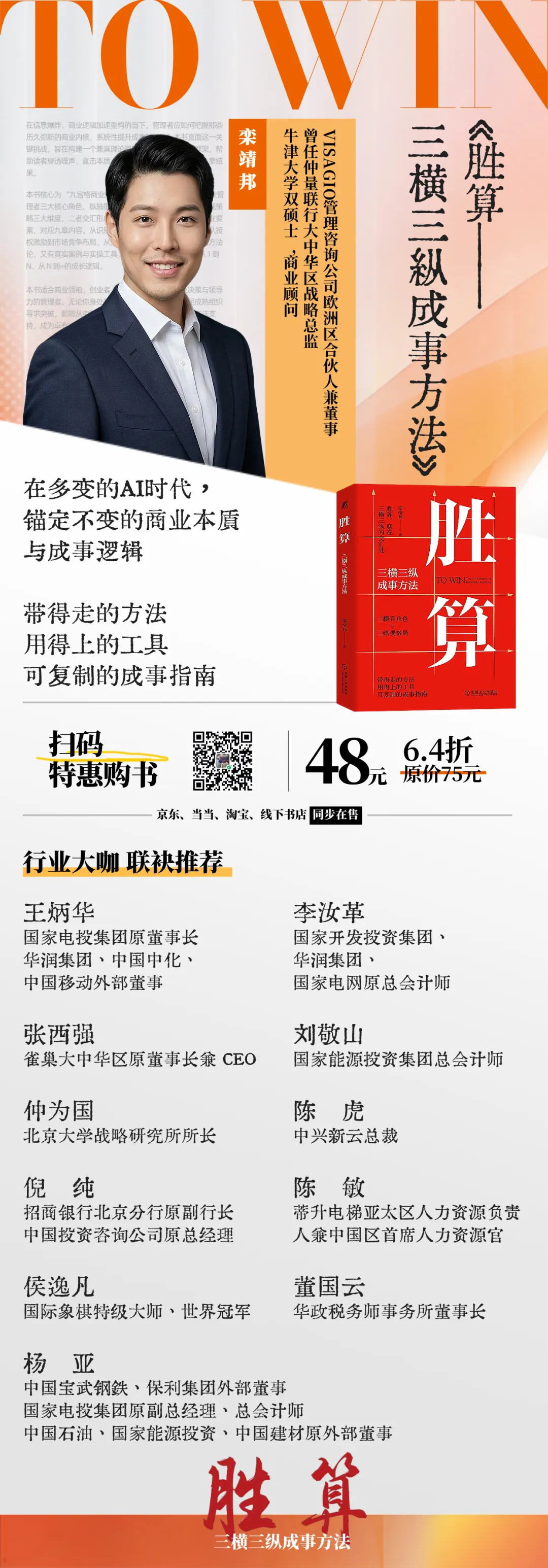 很多事的背后其实藏着一整套结构——那些分散的信息、混乱的判断、反复踩的坑,其实可以归集成一个有逻辑、有架构的框架。新书《胜算:三横三纵成事方法》中的“九宫格商业模型”,就是这样一种尝试:用三横三纵的框架,把复杂问题拆成可识别、可操作的认知节点,让模糊的判断变得有锚点。【长按下图识别二维码,优惠购书】