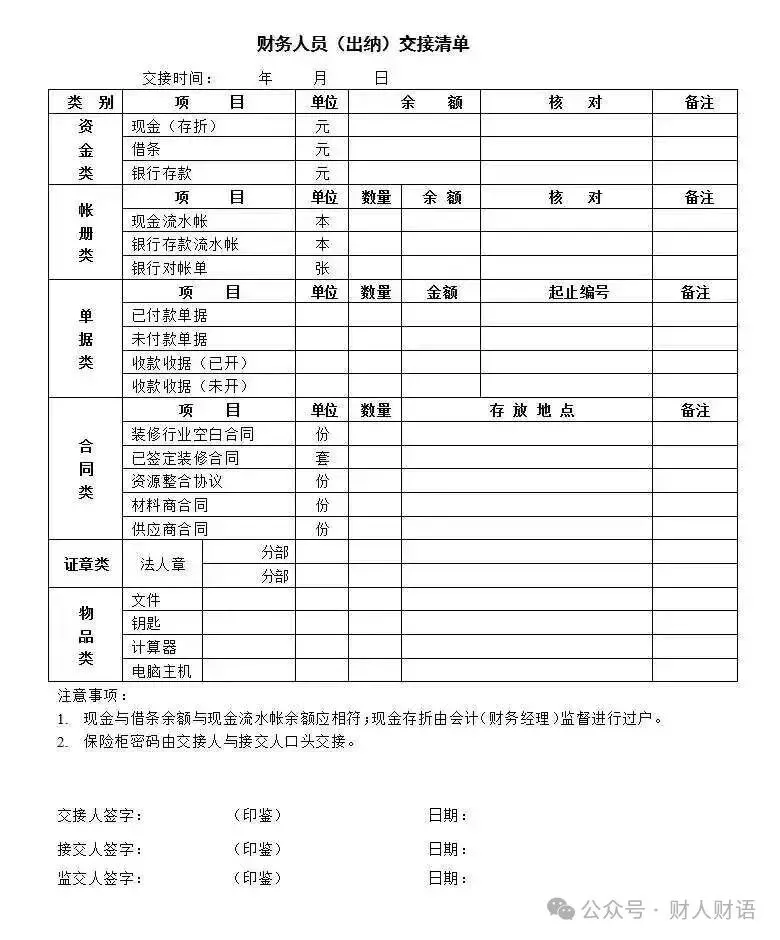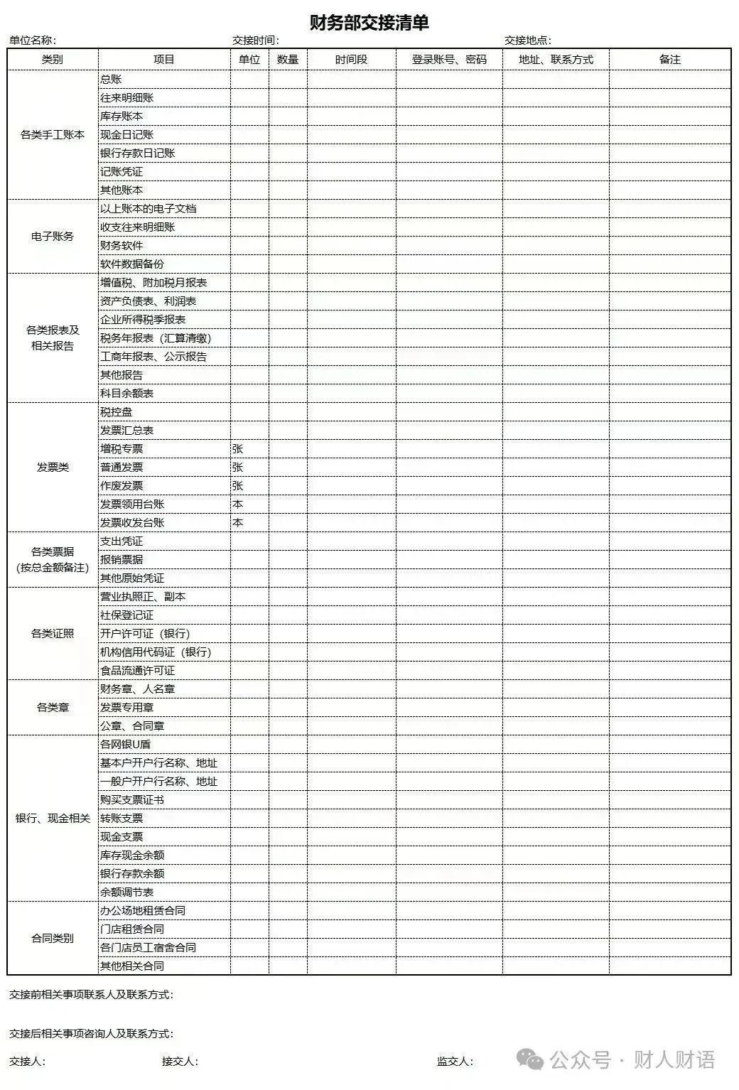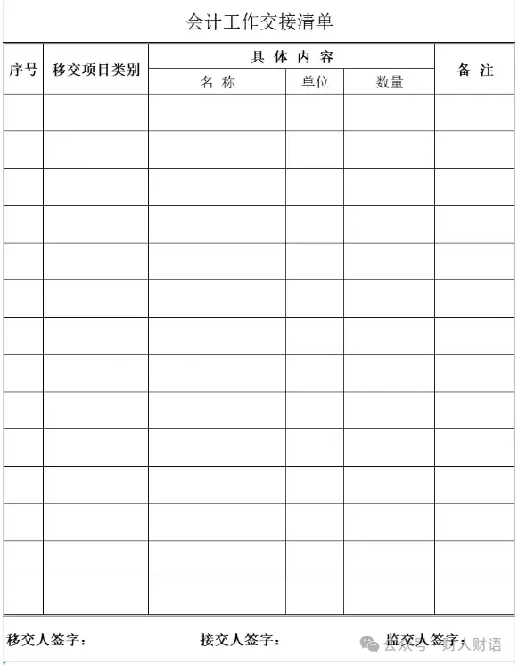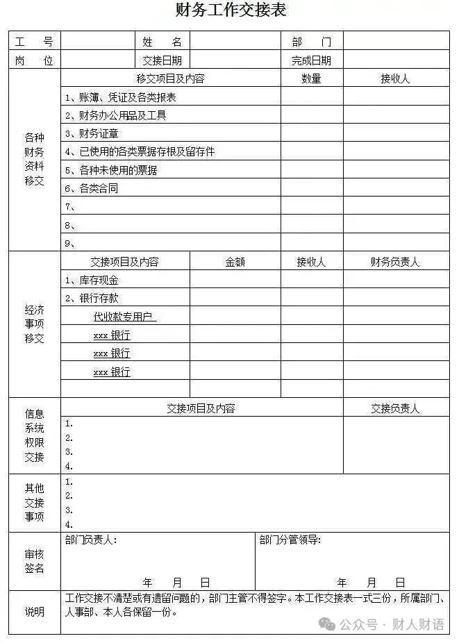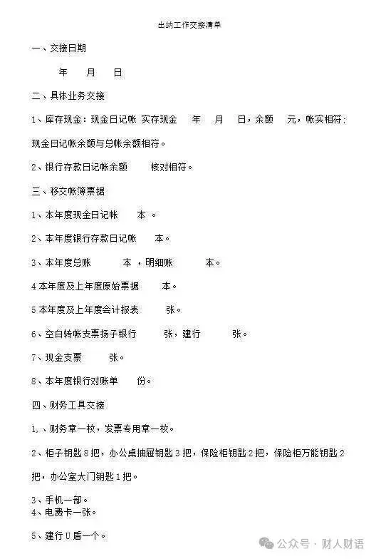 财务人员交接单模版(参考)感谢朋友关注财会审计帮公众号,在文末点一下"赞"和"在看",可以每天收到推文!同行交流与获取资料:1.加QQ群:1035451779,2.加小编微信:geyun82629备注“入群”加入财务、审计微信群。最简易通用交接单:财务部门交接清单模版:出纳交接单模版:来源:网络-END-文件下载:5月份行政事业单位培训课程计划.xlsx行政事业单位会计责任边界重塑与财务合规风险闭环管控.docx“行政事业单位内部审计专业能力标准化建设与数智化转型”.docx