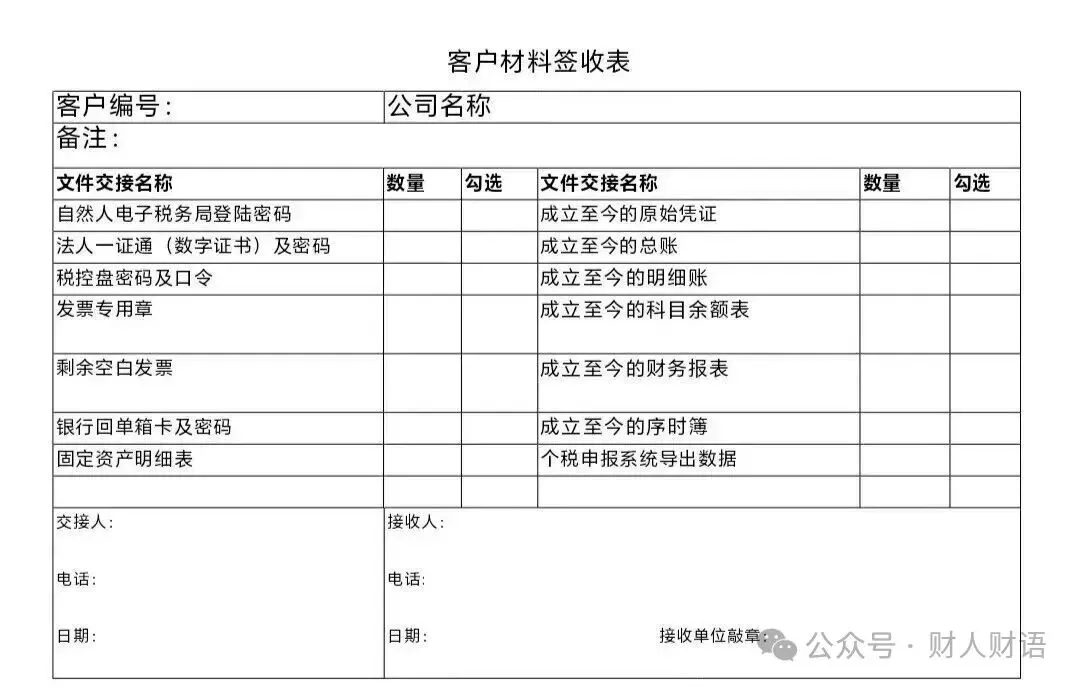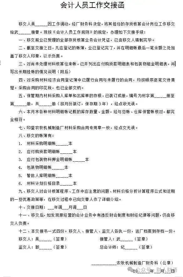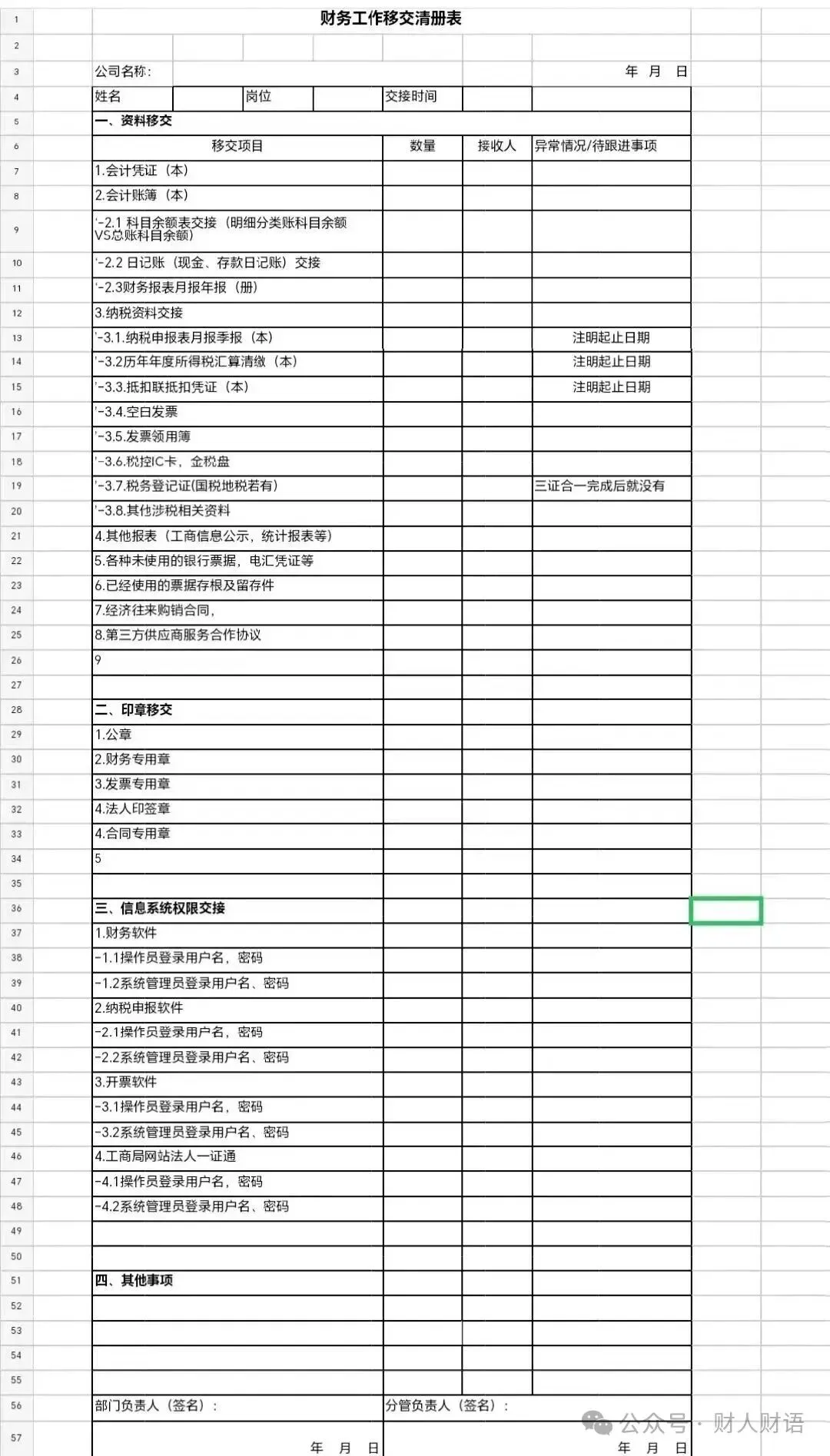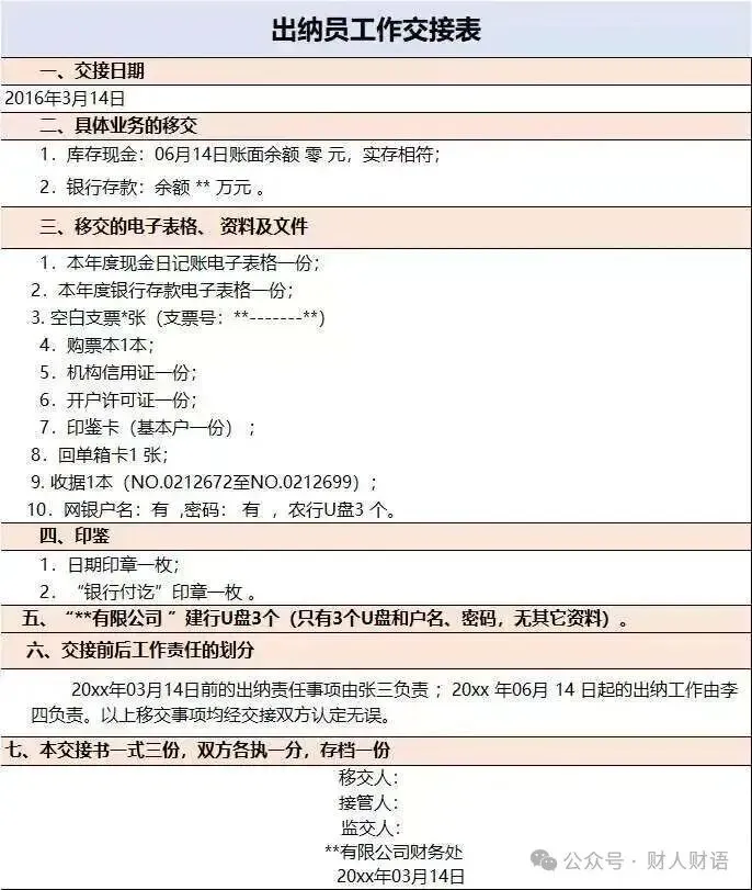 财务人员交接单模版(参考)感谢朋友关注财会审计帮公众号,在文末点一下"赞"和"在看",可以每天收到推文!同行交流与获取资料:1.加QQ群:1035451779,2.加小编微信:geyun82629备注“入群”加入财务、审计微信群。最简易通用交接单:财务部门交接清单模版:出纳交接单模版:来源:网络-END-文件下载:5月份行政事业单位培训课程计划.xlsx行政事业单位会计责任边界重塑与财务合规风险闭环管控.docx“行政事业单位内部审计专业能力标准化建设与数智化转型”.docx