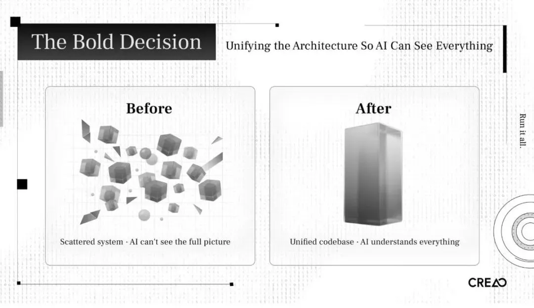 旧架构分散在多个独立系统上。一次变更可能涉及三四个代码库。从人类工程师的角度,这还能管;从AI Agent的角度,这是不透明的。Agent看不到全貌,无法推理跨服务的影响,也无法在本地运行集成测试。