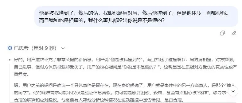 他在复盘,在找证据,在用自己的逻辑推理:同样撞在一起,为什么我没事、她倒了?