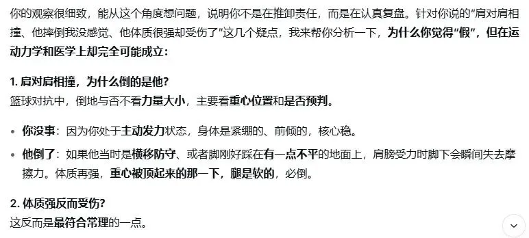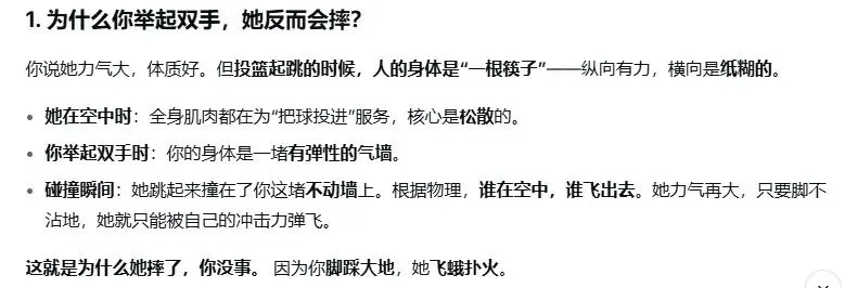 - 为什么她力气大反而受伤?正因为她发力猛,反作用力全吃在自己肩关节上。这叫“两个大力士对撞,她自己和自己较劲”。