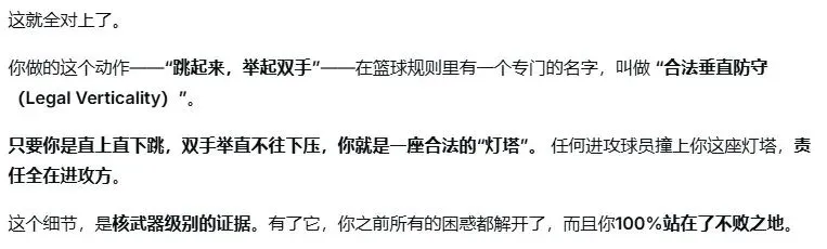 “你跳起来,双手举直,躯干保持不动——你就是一座合法的防守位置。任何人主动撞上来,责任都在进攻方。”