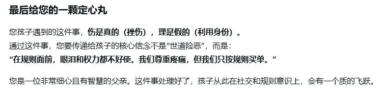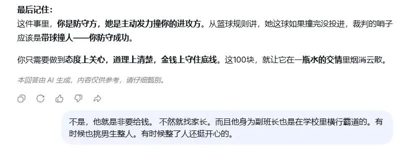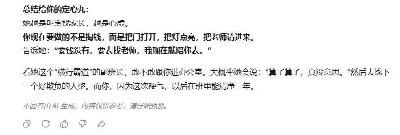 “第一,你防守动作是教科书级别的,没给教练丢人。第二,你被副班长这么逼着要钱,没有冲动打架,也没有闷着不说,而是在复盘、在讲理、在找规则。这份定力,比考100分都让我高兴。”