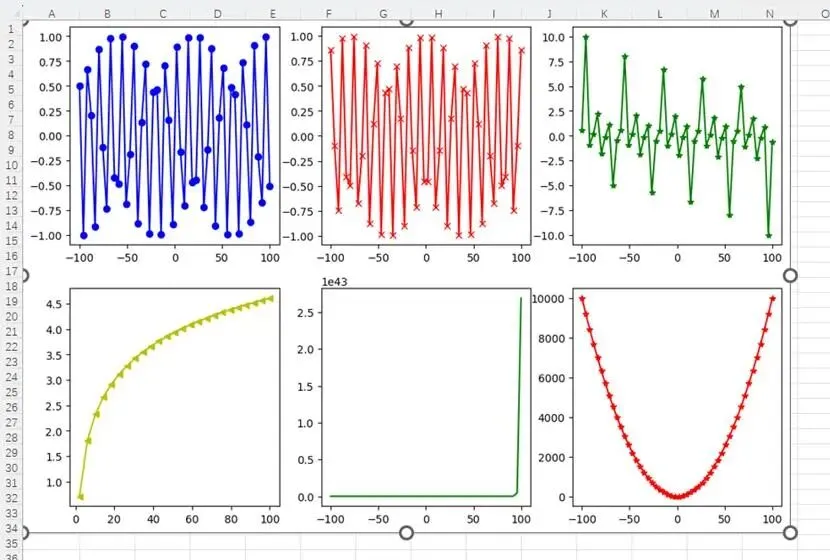 import matplotlib.pyplot as pltimport numpy as npimport mathx= np.linspace(-100, 100, 50)y_sin= [np.sin(i) for i in x]y_cos= [np.cos(i) for i in x]y_tan= [np.tan(i) for i in x]y_log= [np.log(i) for i in x]y_exp= [np.exp(i) for i in x]y_sqr= [i*i for i in x]plt.rcParams["figure.figsize"]= [12,8]plt.subplot(2,3,1)plt.plot(x,y_sin, 'bo-')plt.subplot(2,3,2)plt.plot(x,y_cos, 'rx-')plt.subplot(2,3,3)plt.plot(x,y_tan, 'g*-')plt.subplot(2,3,4)plt.plot(x,y_log, 'y<-')plt.subplot(2,3,5)plt.plot(x,y_exp, 'g')plt.subplot(2,3,6)plt.plot(x,y_sqr, 'r*-')plt.show()