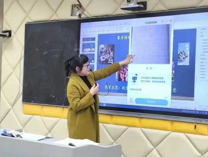 课堂最具亮点的环节当属智能批阅与精准提升,王老师现场展示了 AI 班级管家生成的全班作文批阅情况,AI 从总分、总评、评分详情、全文亮点、提升建议五个维度,对每一篇作文进行了细致入微的标准化分析,精准指出了学生习作中存在的语句不通、详略不当、内容空洞等共性与个性问题。学生们对照 AI 给出的个性化建议再次修改习作,针对性极强的指导让修改过程变得高效有序。王老师还巧妙运用豆包 AI,将学生作文中的精彩描写转化为生动直观的图片,让文字的画面感跃然眼前,极大地激发了学生的写作兴趣与创作灵感。最后,课堂通过小组合作互评、优秀作品推荐交流的形式,让同学们在互相学习中取长补短,进一步完善作品,王老师还布置了制作《家乡的风俗》班级作品集的课后延伸任务,鼓励学生为文章配插图或拍摄家乡风俗视频,持续深化学习效果。