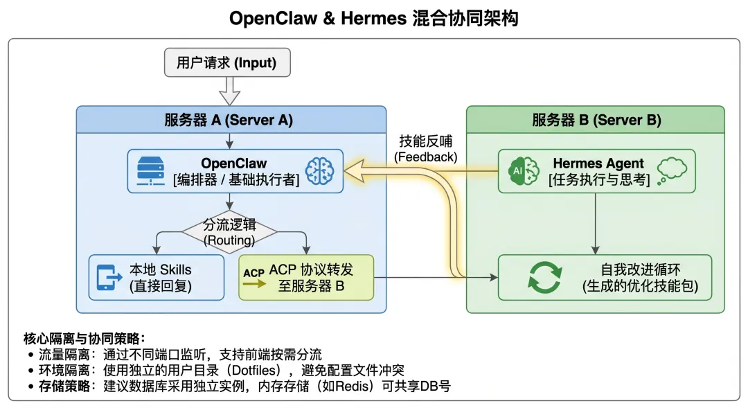 OpenClaw 负责消息路由和基础协调 Hermes 处理需要自我改进的复杂任务 两者通过 ACP 协议连接