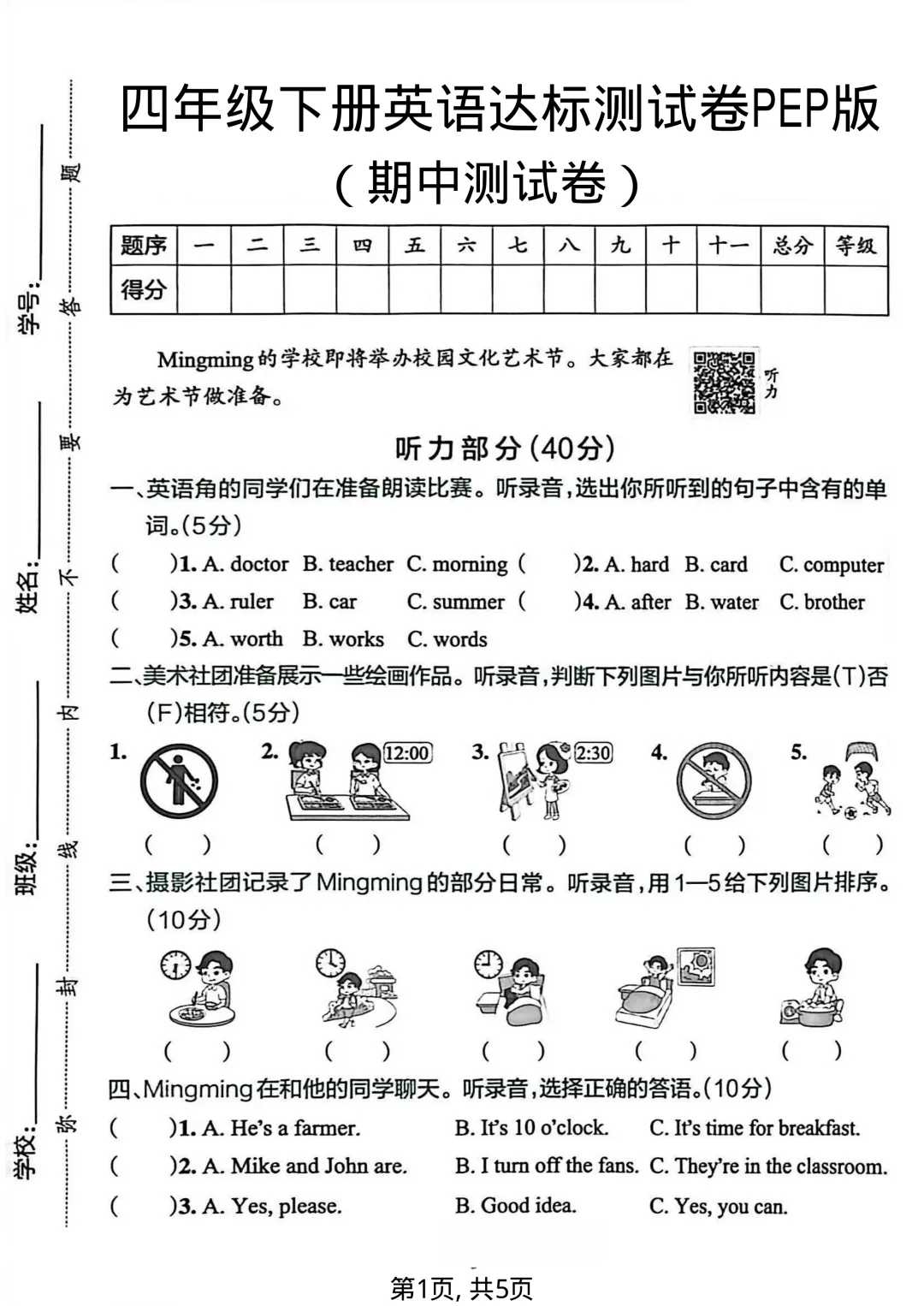 【免费下载】四年级(下)英语 期中达标测试卷《人教版PEP》,可打印,PDF电子版
