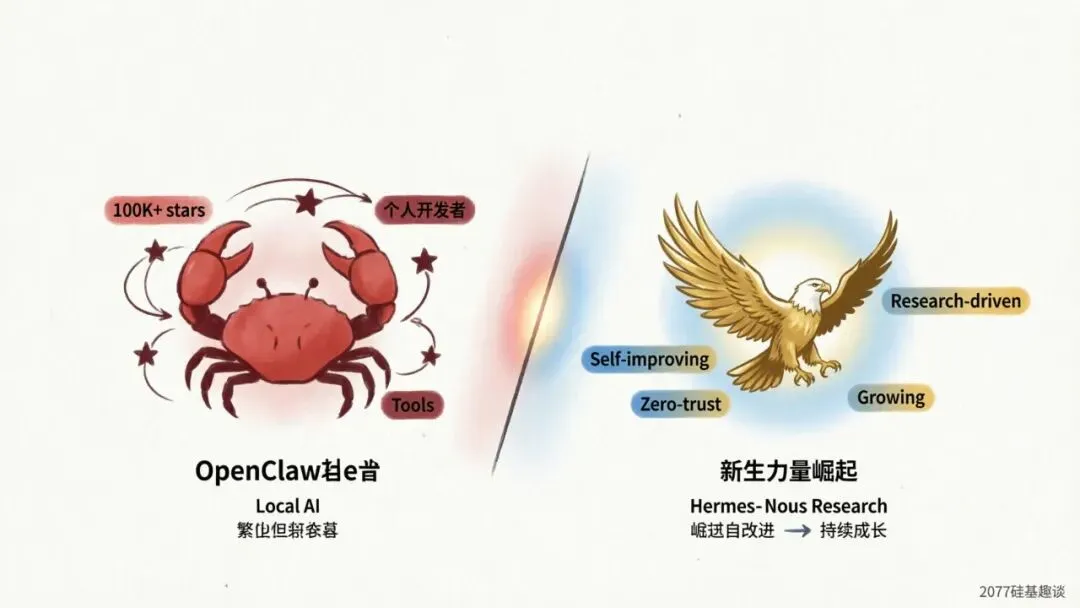 另一边,Hermes Agent——由 Nous Research 在 2026 年 2 月发布的新框架——正在开发者社区快速圈地,以"自改进"为核心卖点,与 OpenClaw 正面交锋。