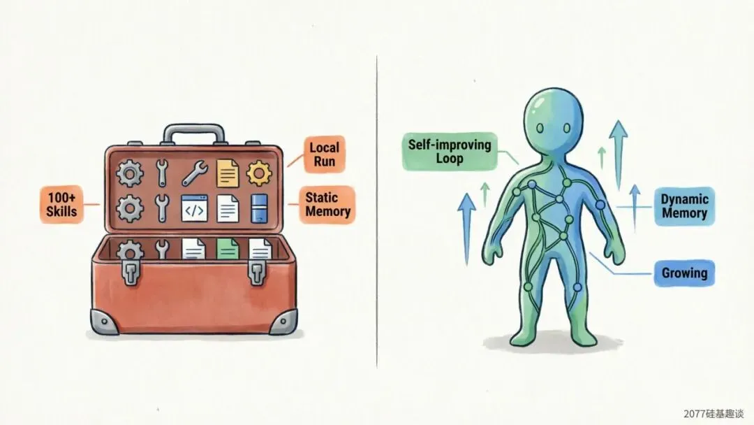 简单说:OpenClaw 是一个工具。Hermes 是一个会成长的工具。