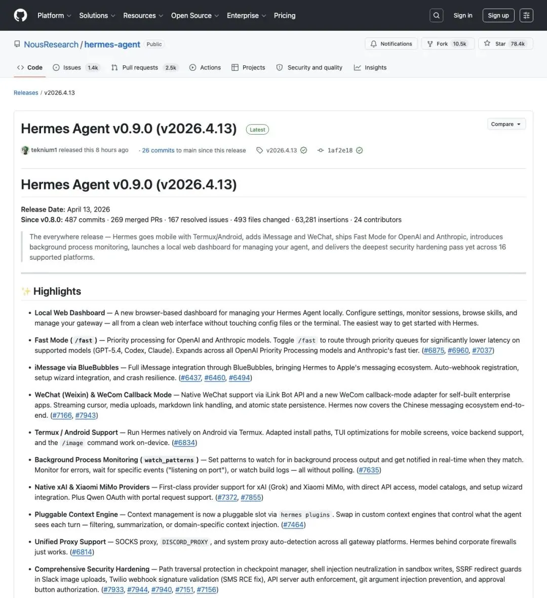 「中译:这是一版真正的"Everywhere"更新——Hermes上了Android/Termux,接入iMessage和微信,加入Fast Mode、后台进程监控和本地Web仪表盘,并完成了迄今最深度的安全加固,覆盖16个平台。」
