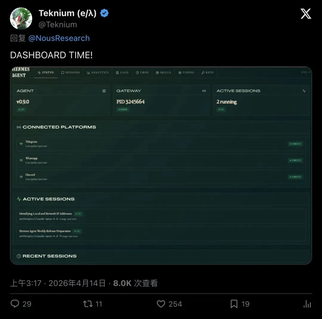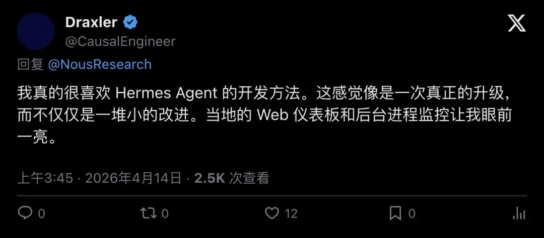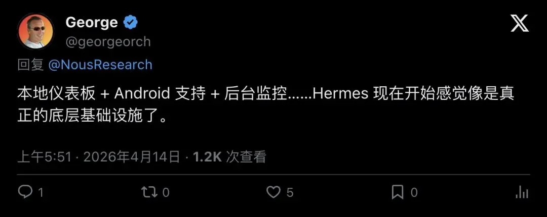 「本地仪表盘 + Android支持 + 后台监控……Hermes现在开始感觉像真正的基础设施了。」