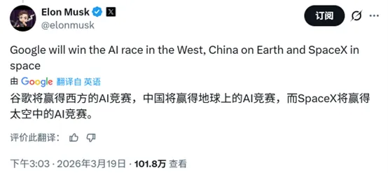 2026年3月19日,马斯克在X平台发帖称,谷歌将赢得西方的AI竞赛,中国将赢得地球上的AI竞赛,SpaceX将赢得太空领域的AI竞赛。