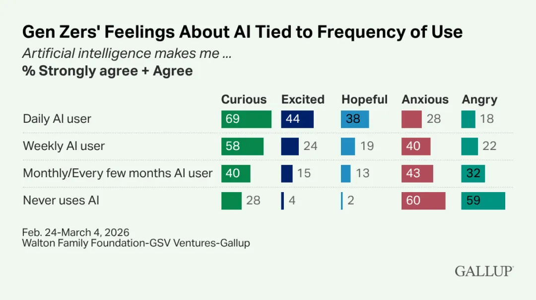 Z世代对AI的感受与他们使用频率密切相关。在日常用户中,69%的人表示感到好奇,44%感到兴奋,38%感到希望。相比之下,从不使用AI的人群中,28%感到好奇,4%感到兴奋,2%感到希望。