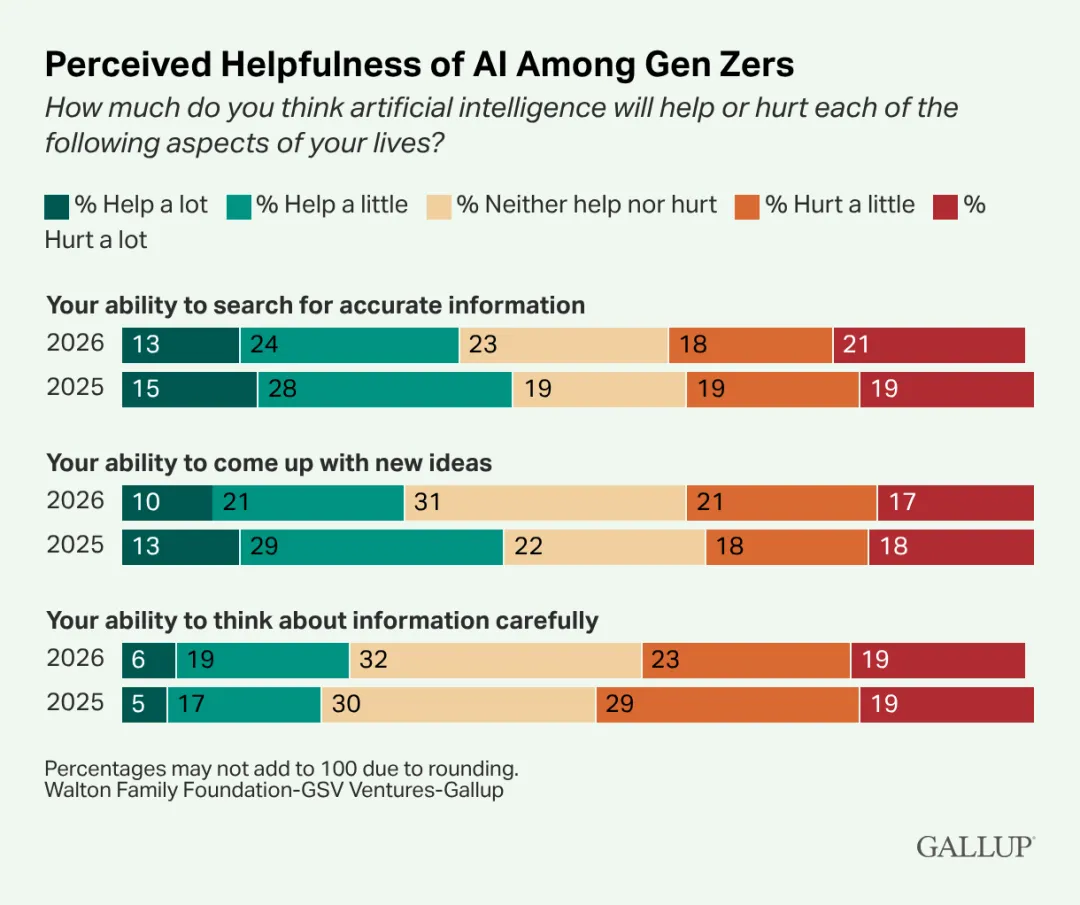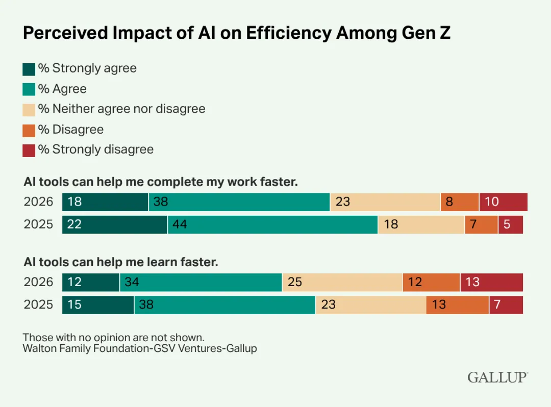 与2025年相比,现在更少的Z世代相信AI能提高学习和完成任务效率。目前有56%的Z世代同意或强烈同意AI工具能帮助加快工作速度,比2025年下降了10个百分点;而同意AI能加速学习的比例下降了7个百分点,降至46%。