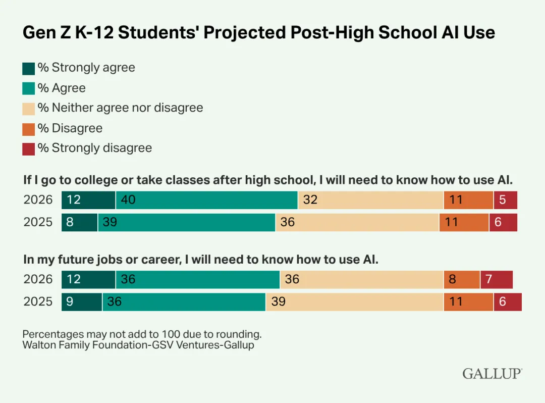 52%的Z世代K-12学生(高于2025年的47%)同意或强烈同意,如果他们想上大学或在高中毕业后继续学习,就需要知道如何使用AI。几乎同样多的人(48%)认为他们在未来的工作或职业中需要知道如何使用AI,这一比例与去年相比在统计上相似。