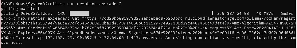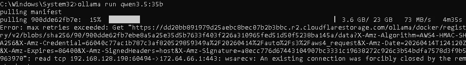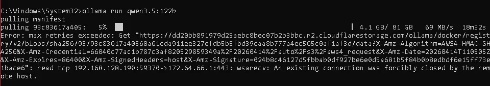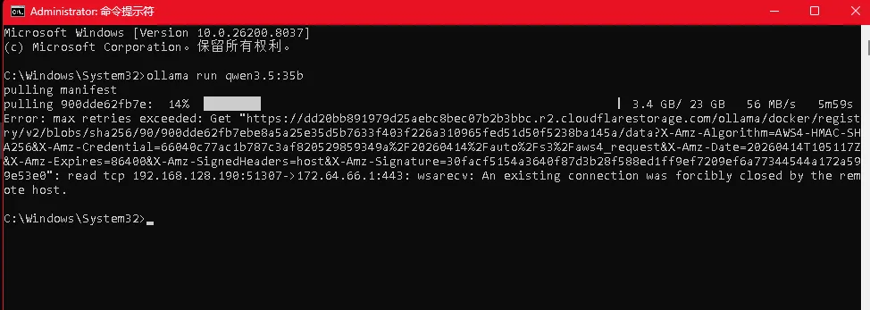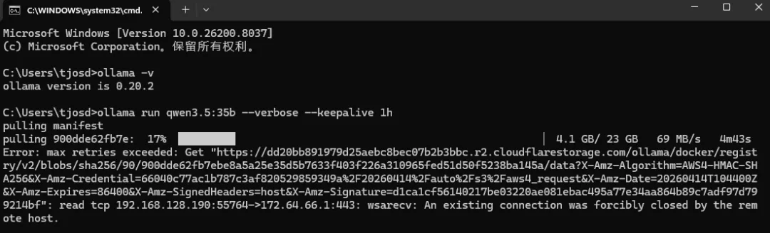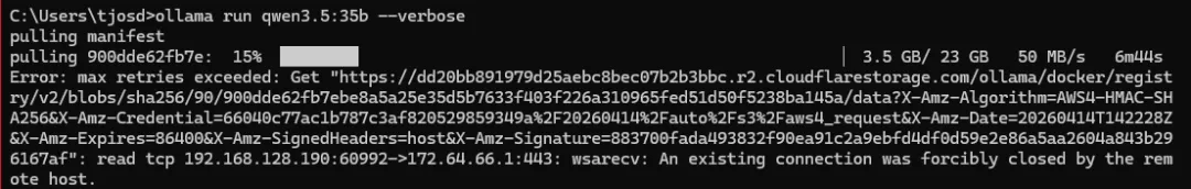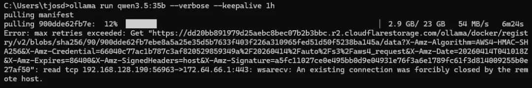 1399、下载qwen3.5 35b总是报错怎么回事? 通过Ollama 部署本地大模型是常用的方法,并且使用了长时间,没有发现什么 异常情况,一直很顺利,无论模型参数大,小都可以顺利下载运行,无论下载速度快慢,还是运行速度快慢都不影响正常部署成功使用。 但今天下载qwen3.5:35b的时候一直不成功: 每次下载到12%~13%的时候,它就报错,报错的内容相同,开始以为是空间不够,经过检查发现空间没问题,还很富裕,如果是空间的问题,不会下载12%才开始出现错误,原先也遇到过,会直接报空间不够,或内存不够。我前面下载过很多不同的大模型,都没有遇到过这个提示,我以为是下载的太多,ollama 不愿意,所以才给我断开了,我删除了有4-5个大模型,还是不行,我以为每种品牌的大模型下载数量有限制,原先这个3.5 下载过5个版本 0.8b 2b 4b 9b 27b,我删除了两个大的9b和27b也不管用,应该是触发了ollama的某种机制导致,猜测不到有什么机制。 另外,这电脑每次都是选择休眠,而不是关机,可以随时远程开机,是不是这个原因造成的呢?重新启动一下电脑就可以测试出是否和这个有关系。 看到C:\Users\tjosd>ollama -v ollama version is 0.20.2 这个是现在使用的版本,这个QWEN3.5的大模型是上周才更新的,而且这里有升级提示,是不是版本冲突造成的,可以先升级一下看 重新启动一下电脑,然后再进行下载,开始过了13%一直没有报错,以为是解决问题,结果到了17%又出现了相同的错误信息这个是24G的,也不行,随便找了一个小的模型,能成功下载工作。原先十几个G的模型也下载成功过,现在能运行的还有gemma4 31b 的19G没有问题: 更早的deepseek 400多G的大模型都没问题,都可以成功下载,带宽也没问题每秒60-70MB/S的下载速度。 是看下载的模型太多,限制下载了?没听说有这个机制。 重新启动路由器、重新启动光猫,看是不是这个原因造成的?现在判断服务器端或者路径有问题的可能性比较大了,估计重新启动也不管用。 设备都重新启动过以后,也不管用,到15%就报相同的错误了。 这是最直接的方案,通过环境变量让Ollama更强悍地应对网络抖动。
