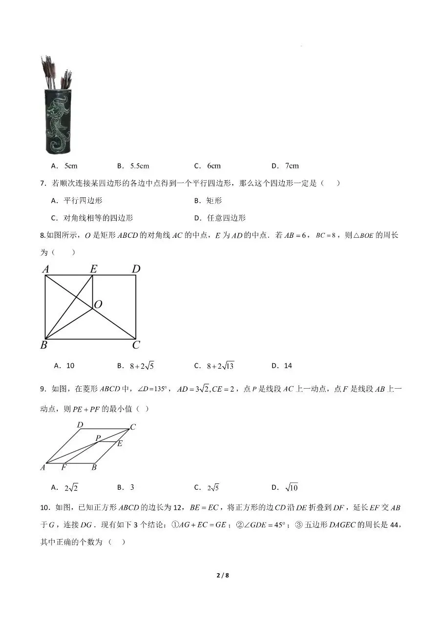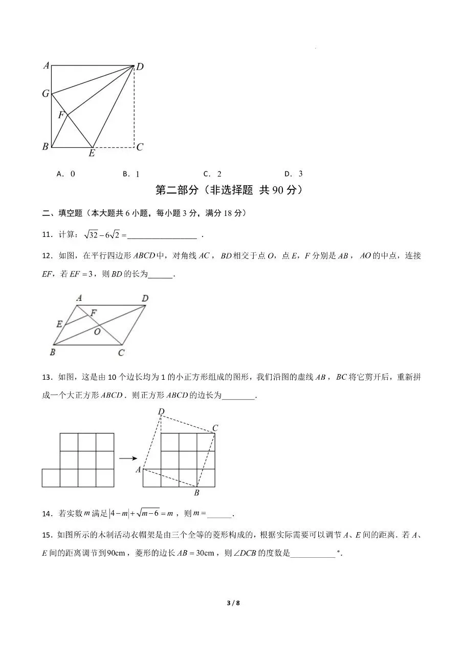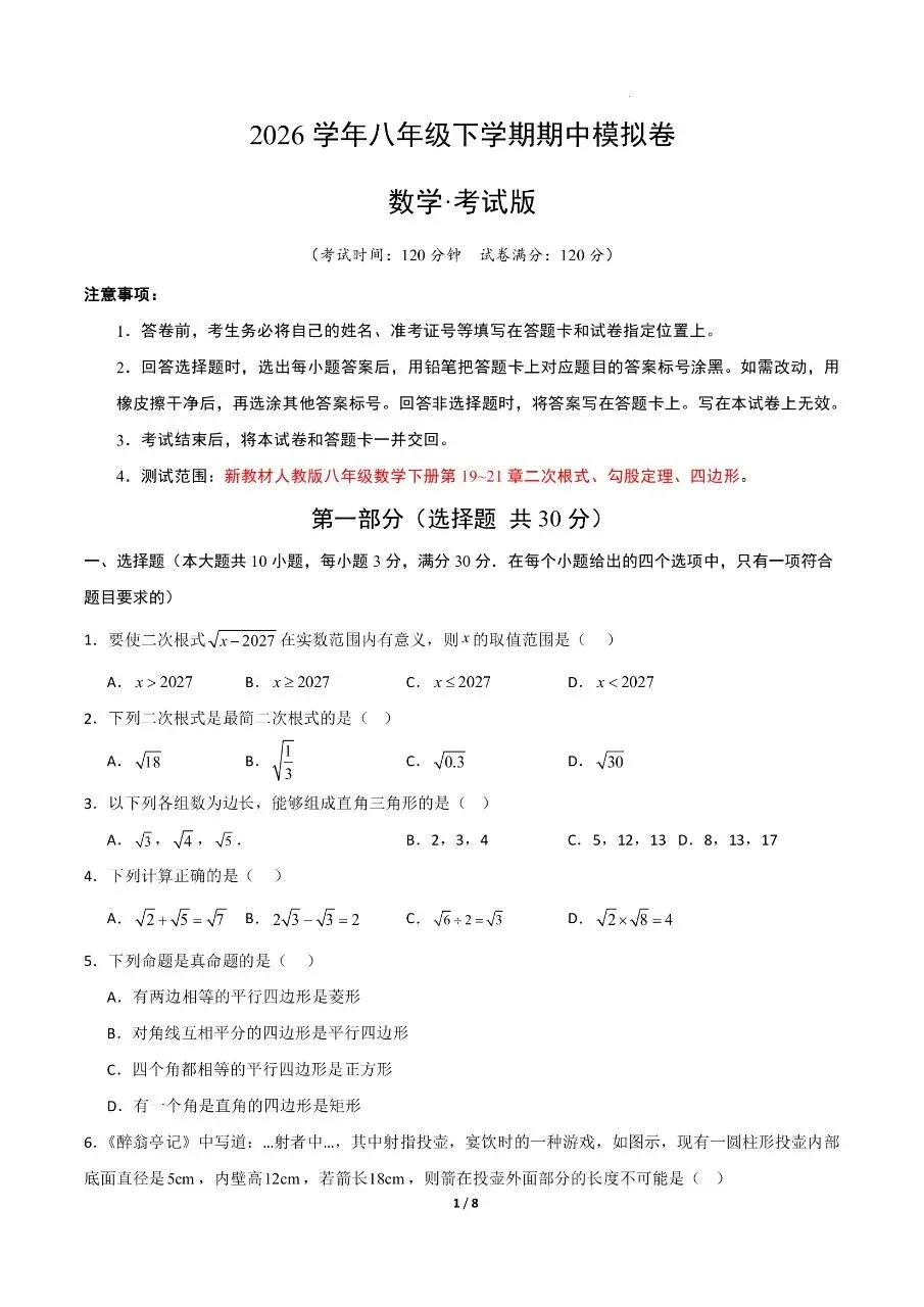 满分120分、时长120分钟,考查范围为二次根式、勾股定理、四边形三大章节。试卷含选择、填空、解答三类题型,重点考查根式运算、直角三角形判定、平行四边形/矩形/菱形/正方形性质与折叠、动点最值、几何证明,压轴题综合坐标系与正方形变换,附完整详细解析。