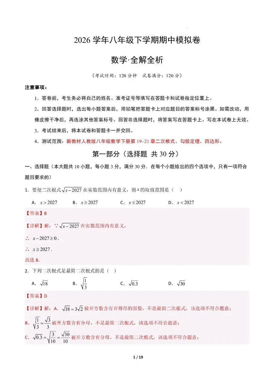 八年级下册数学|期中考试模拟卷2(可下载打印)初中资料每日更新,具体看完整PDF版本