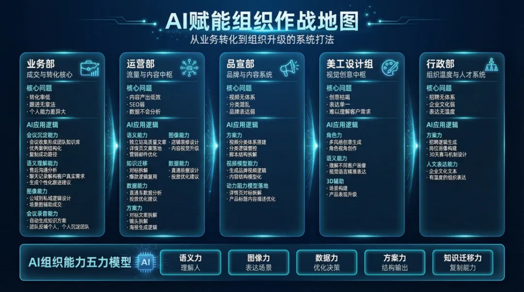 基于这些实战经验,我们总结了一套AI 赋能组织作战地图,涵盖 5 大核心能力: