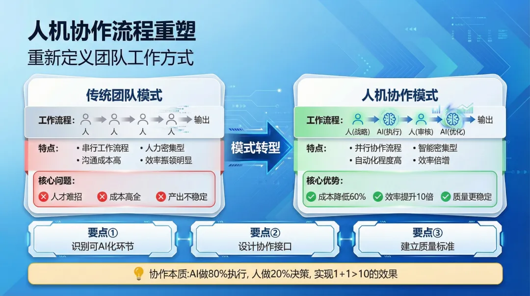 AI 最好的使用方式是"增强人",不是"替代人"。让员工学会用 AI 提升效率,而不是担心被 AI 取代。
