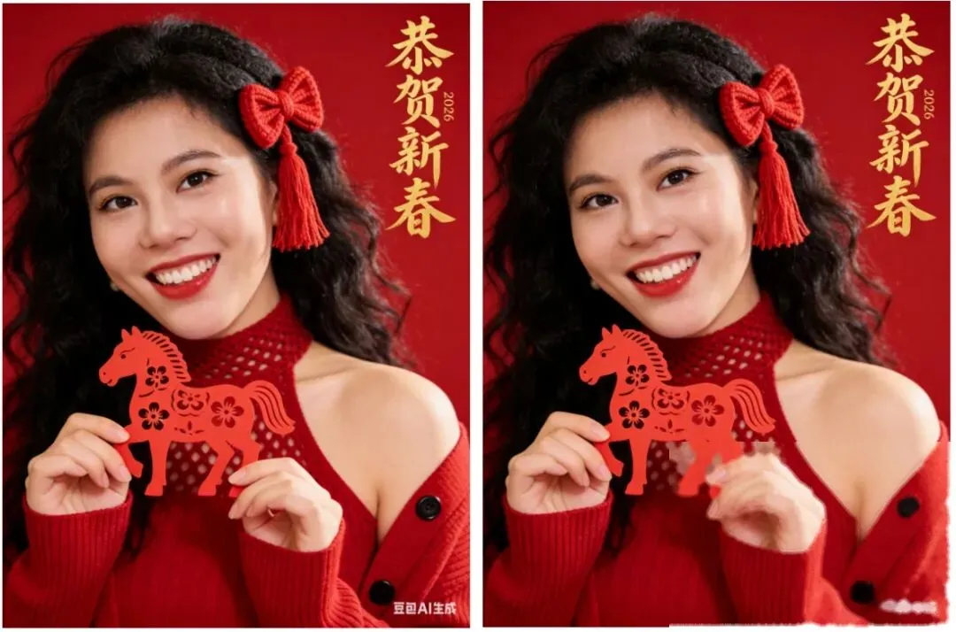 保留原图五官脸型基本特征不变,生成3张动作不同写真,3张服装需保持一致!竖幅近景平视构图,人物双手持红色剪纸马(纸质镂空工艺,马身饰梅花纹样)举于胸前,眼神明亮直视镜头,嘴角含笑露梨涡,表情甜美喜庆,满是2026马年新年氛围。发型为黑色羊毛卷长发,发丝蓬松凌乱有层次感,右侧发间别红色针织蝴蝶结发饰;妆容为马年新年甜妹妆,底妆白皙清透,眼妆以红棕调珠光眼影提亮,唇妆为正红色镜面唇釉。身着红色针织套装;纯正红背景,右上角有金色书法字体"恭贺新春",打光为暖白柔光,32k高清分辨率,真人皮肤纹理。比例3:4。