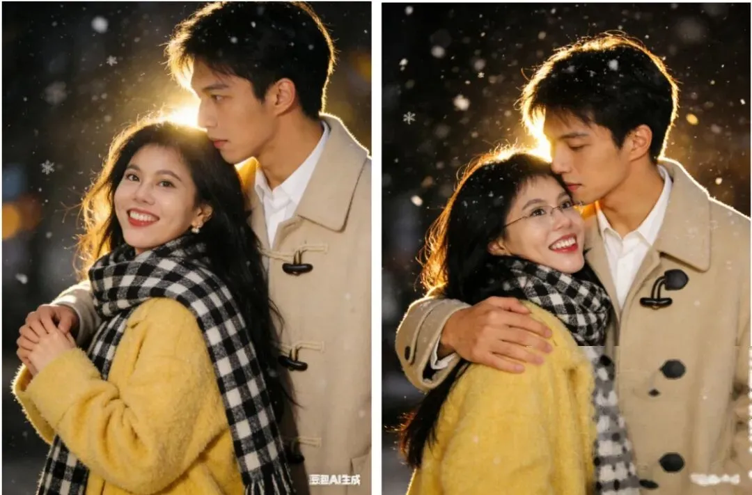 参考人物形象,保持人脸一致性,日系胶片风夜景人像,暖黄色逆光营造轮廓光,面部柔和补光,背景虚化呈暖调夜景氛围。情侣合照,女生容貌绝美,长发,呈侧身回眸动态姿势,面带甜美微笑;身着黄色毛绒大衣,搭配黑白格纹大围巾。男生青春帅气,从后方轻拥女生,身着米色牛角扣大衣,内搭白色衬衫,表情宠溺。画面点缀雪花元素,采用暖色调胶片滤镜,带有轻微颗粒感,比例「3:4」,生成四张