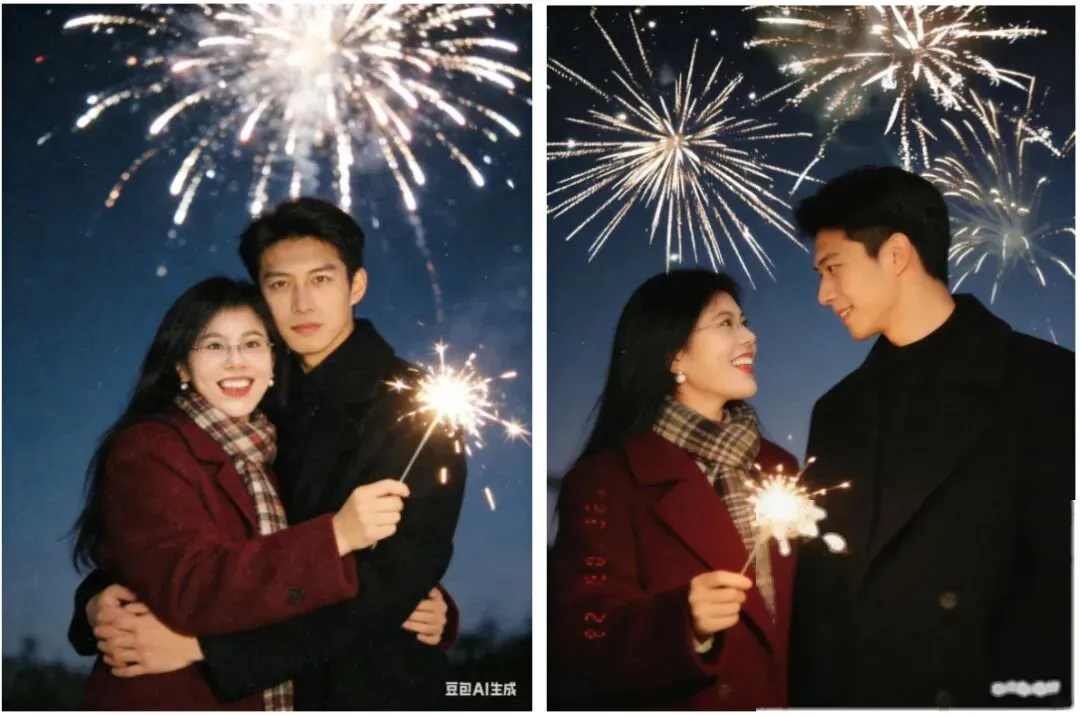 参考人物形象,保持人脸一致性,dv机低分辨率质感风格,高颜值情侣,男生穿着黑色大衣,女生穿着冬日穿搭,系着格纹围巾,暗红色毛呢大衣,手持仙女棒,背景是烟花绽放的夜晚天空,细节丰富极度精致,画面整体呈现低饱和复古色调,颗粒感明显,噪点自然,镜头轻微晃动效果,比例「3:4」,生成四张