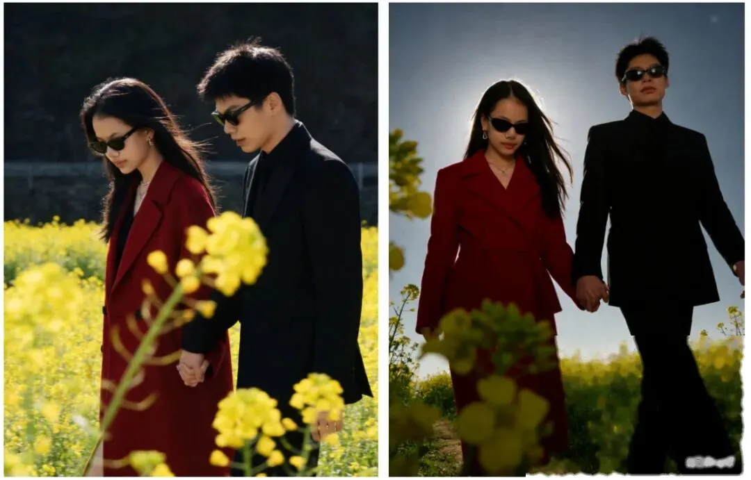 参考人物形象,保持人脸一致性,油菜地室外场景,女生带墨镜低头向前走,男生牵手女生,女生发型披着头发,妆容十分精致,穿红色大衣;男生五官立体,戴墨镜,穿版型很好的黑色西装。以站姐视角路透抓拍,镜头前景有遮挡物,像偷拍的感觉,皮肤白皙通透,微风吹头发,画面偏暗调,镜头轻微抖动,中度颗粒感,突出高级感、拽酷气质,比例「3:4」