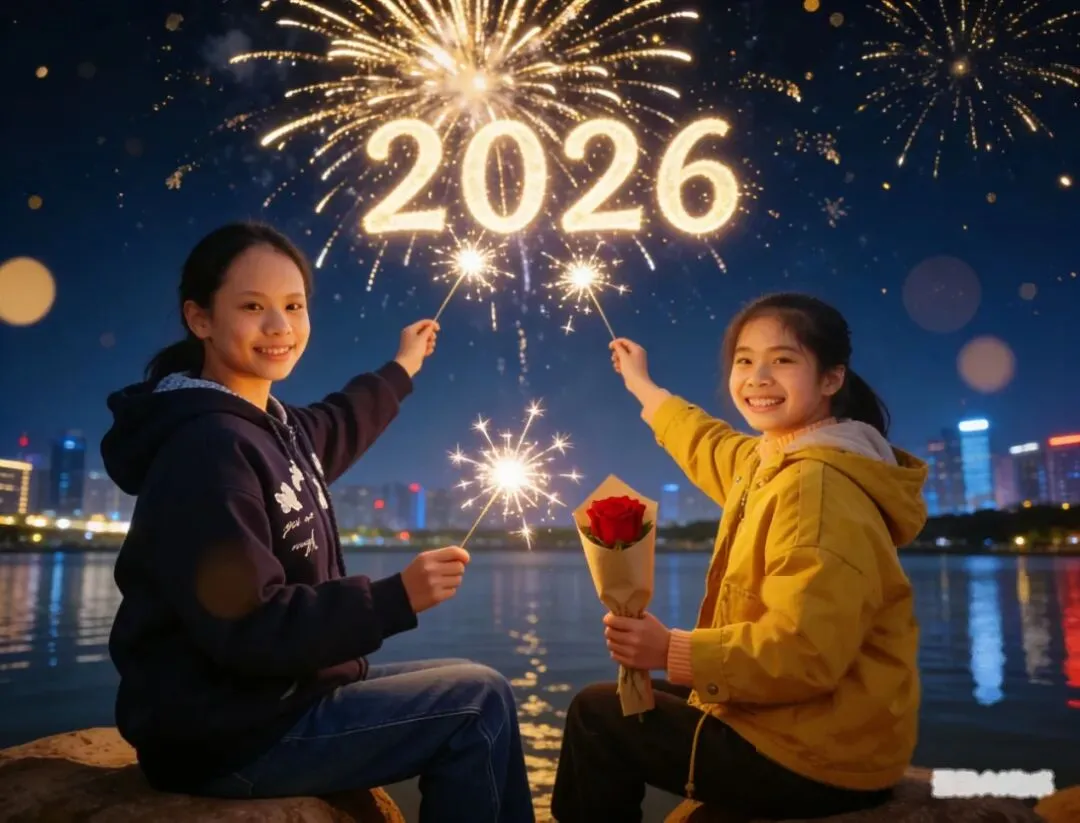 图中两位女孩衣着不变,两人一手举点燃的烟花棒(火花炸开呈星芒状),一手轻握牛皮纸包装的红玫瑰,侧身对着镜头笑眼弯弯,背景是城市夜景+漫天金色烟花+悬浮2026字样,大光圈虚化,暖光打在脸上,画质4K高清,柔焦质感,比例「4:3」
