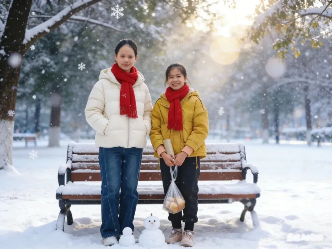 参考图中两人,两人分别身穿米白色羽绒服和黄色羽绒服,围着红色围巾,站在白雪皑皑的公园长椅旁,脚边堆着小雪人,雪花缓缓飘落,阳光透过树枝洒下光斑,清新治愈风,比例「4:3」
