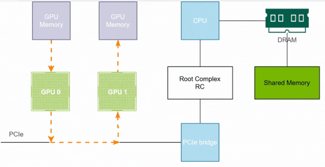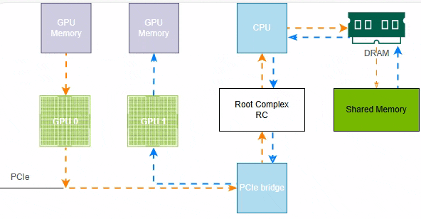 如下示例,受限于硬件条件,无NVLink、不支持PCIe P2P,GPU0的数据要发送给GPU1,首先GPU0的显存数据通过PCIe和CPU协调存储到系统共享内存(Shared Memeory),然后GPU1通过CPU和PCIe将数据读取到GPU1的显存中。