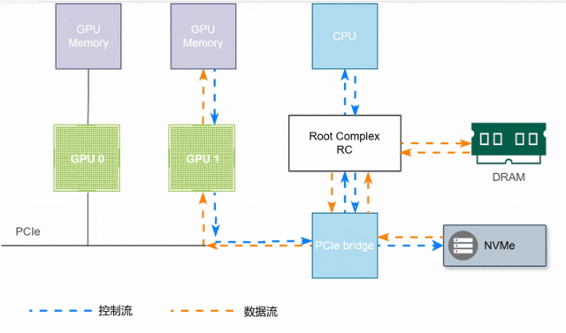 如下图所示,GPU1访问NVMe盘数据,需要CPU和内存的参与,延迟较大。