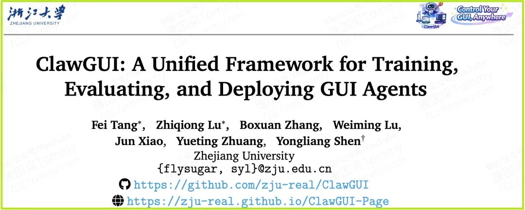 论文信息:ClawGUI: A Unified Framework for Training, Evaluating, and Deploying GUI Agents,来自浙江大学等机构,2026年4月发表于arXiv。