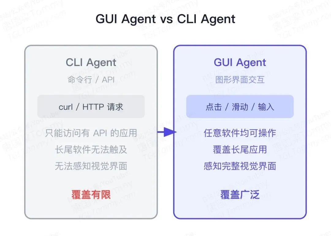 没有开放API的老系统、没有接口的定制软件、数量庞大的移动端应用——这些CLI Agent完全触达不到。这就是为什么即便Agent概念如火如荼,真正能在普通人手机上帮你完成日常任务的AI助手,始终停留在演示视频里。