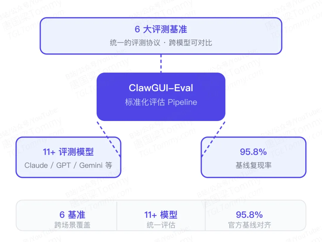 ClawGUI-Eval构建了一套跨模型、跨基准的标准化评测pipeline,覆盖6大主流评测基准、11款以上模型(包括Claude、GPT、Gemma等),实现了95.8%的官方基线复现率。