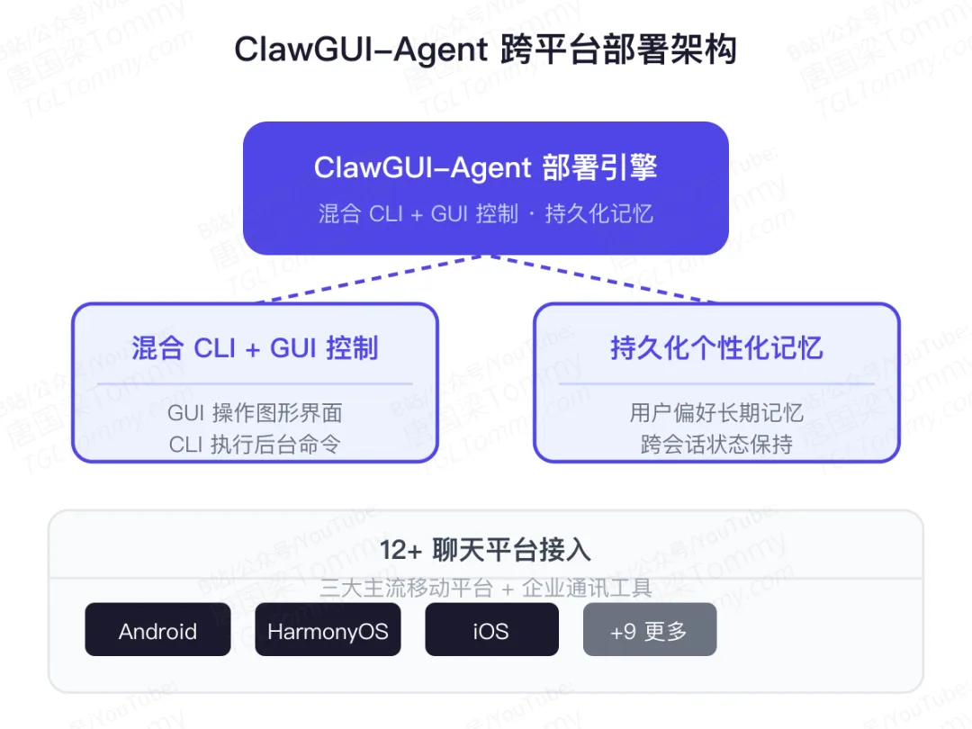 多平台支持:通过统一的抽象层,支持Android、HarmonyOS、iOS三大主流移动操作系统,以及12个以上的聊天平台接入(企业微信、飞书、Slack等)。